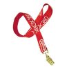 A high quality silk screened lanyard made out of a flat woven polyester material.